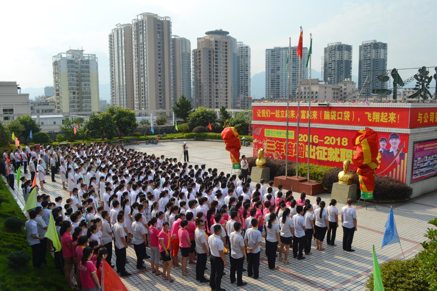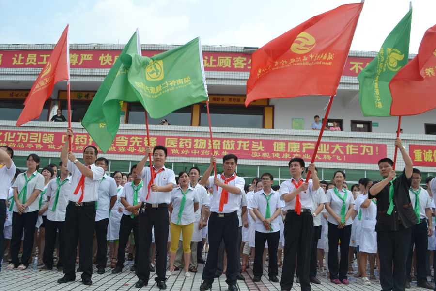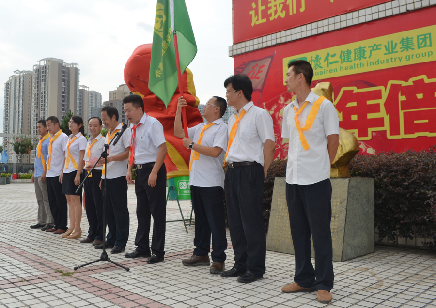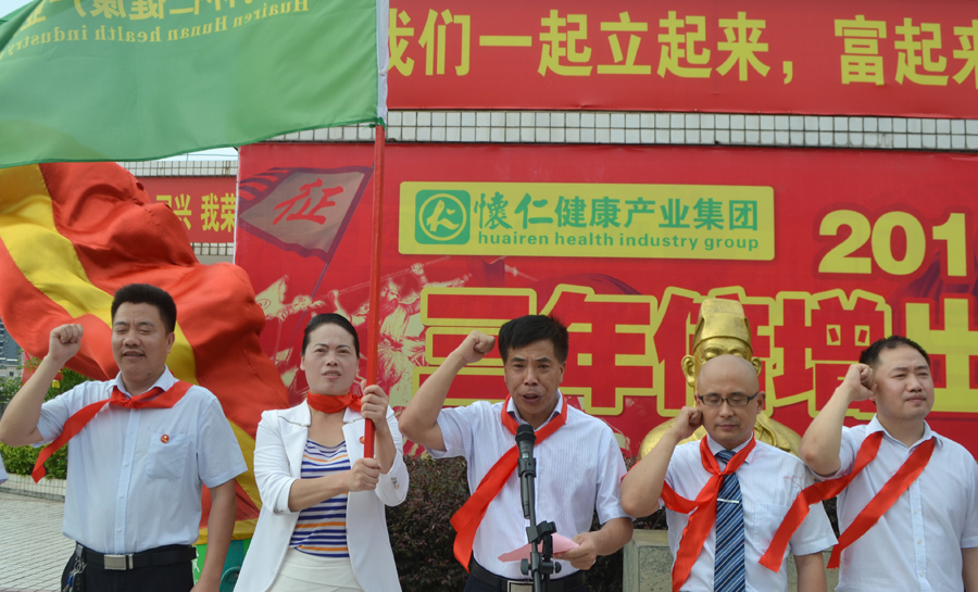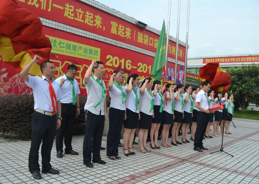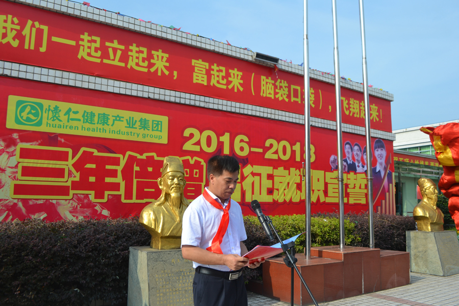 2015年6月30日上午,又是一个艳阳高照、充满希望的日子,怀仁集团总部文化广场战鼓阵阵、彩旗飘飘,怀仁集团2016-2018财年“三年倍增出征就职宣誓”仪式隆重举行。怀仁集团董事长兼总裁林承雄、执行总裁兼党总支书记陈毳萍、怀仁集团辖怀仁药业有限公司、怀仁大药房连锁有限公司、优康宝贝母婴用品连锁有限公司、博世康中医药股份有限公司、博世康龙脑科技有限责任公司、麻阳博世康寿山无量泉有限公司、湖南真的好养生产业发展有限公司、华夏神履亚健康调理中心、阳光体检中心、脊椎梳理项目、国医城项目等11个分公司和项目负责人共500余人参加宣誓仪式。集团常务副总裁周永长主持仪式。