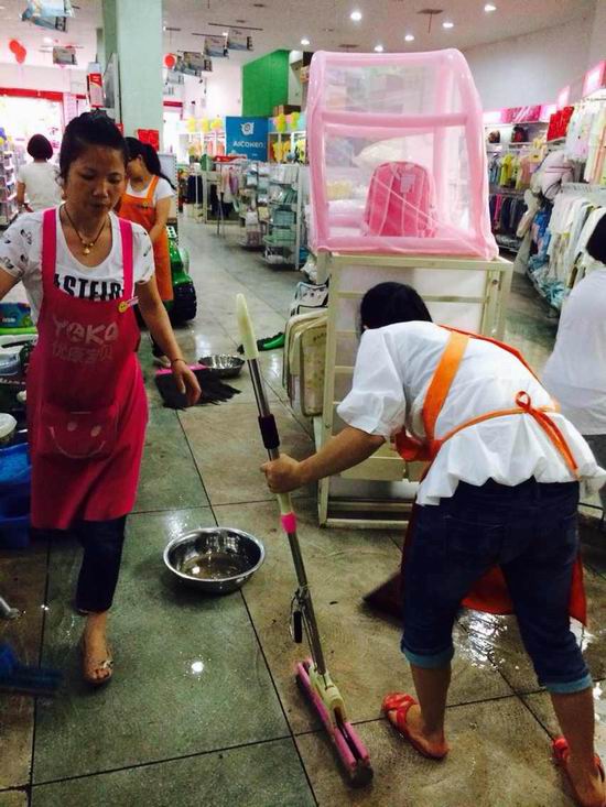 小丹是我们优康宝贝溆浦商城店的店经理,因为门店后墙靠近下水道 ,前几天下爆雨时水就溜进了门店,幸亏大家抢险及时,商品才没有受到损失。