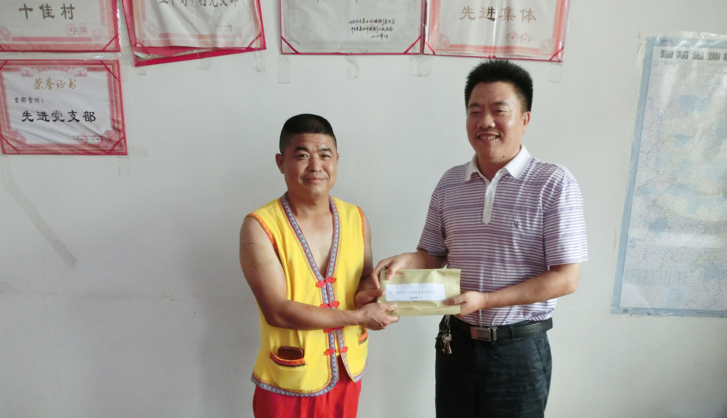 怀仁集团副总裁舒敏将怀仁大药房2万元捐赠款、博世康中医药股份有限公司1万元捐赠款送到吉都堂村副书记杨协青手中。