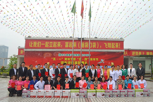 2016年4月29日上午,怀仁集团“五·一”劳动节暨“五·四”青年节评先评优表彰典礼在集团总部隆重举行。怀仁集团执行总裁陈毳萍,副总裁舒敏,集团董事伍健权、韩叶洲,怀仁药业(连锁)总经理刘子杰出席活动。怀仁集团总部后勤及旗下分公司员工代表300余人参加活动。