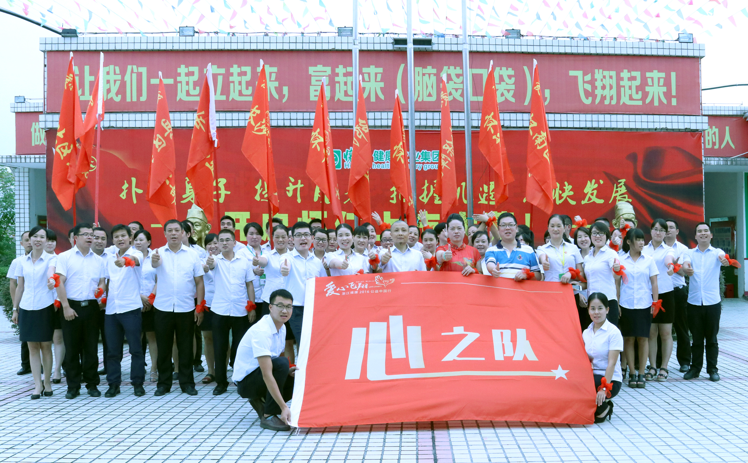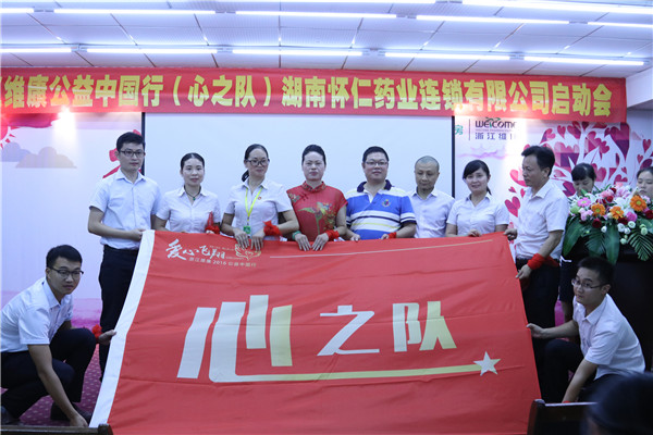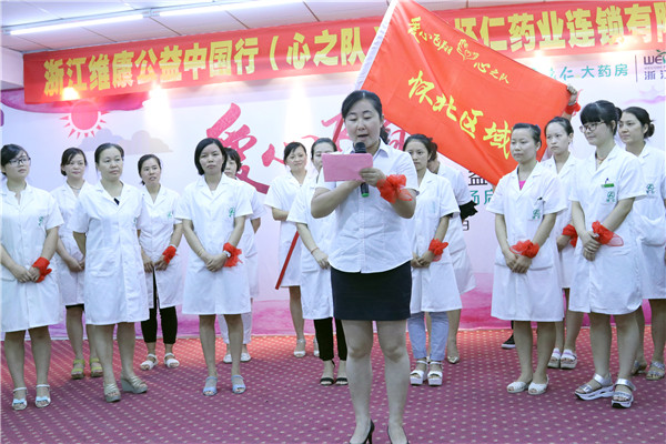 启动会上,所有人员两手交叉成翅膀飞翔的动作,大家绑在手上的红丝带相互交替,全场爱心满满。启动会进行了授旗仪式,怀仁药业(连锁)总经理刘子杰、营运总监张四妹分别为11个团队授旗,各团队群情激昂,庄严宣誓。