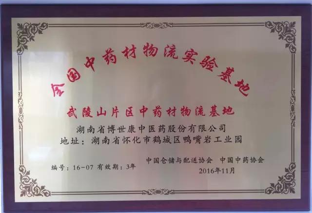 2016武陵山(怀化)健康产业博览会传来喜讯:怀仁集团健康产业园博世康中药材物流基地被中国仓储与配送协会、中国中药协会联合授予“全国中药材物流实验基地”、“武陵山片区中药材物流基地”。这是中国仓储与配送协会、中国中药协会规划建设的第七个“全国中药材物流实验基地”与“武陵山片区中药材物流基地”。