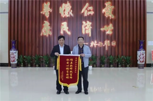 2017年4月5日,怀仁健康产业园迎来了一批特殊的客人,沅陵县沅陵镇南山新村党支部第一书记、市驻村扶贫工作队队长李启云带领南山新村村支书候太龙、村主任张斌、联村干部宋谋团、市驻村扶贫队队员郑文杰等村支两委有关人员一行,来到怀仁大健康智能信息化总部,将一面题写“捐善款修致富路,献爱心摘贫困帽”的锦旗,亲手送到了怀仁大健康林承雄董事长的手里,以表达他们对怀仁大健康爱心修路由衷的感激之情。