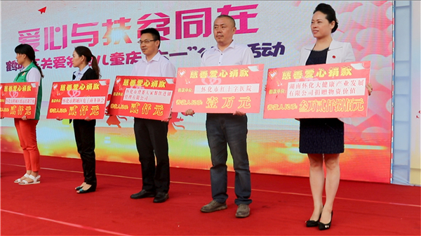 救助贫困儿童,你来了,我来了!2017年6月1日上午,“爱心与扶贫同在”鹤城区关爱贫困儿童庆“六一”公益活动在怀化市委广场顺利举行。怀化市鹤城区人民政府办公室副主任向高怀、鹤城区21个区直单位以及10家爱心企业代表参加活动。活动呼吁全社会关爱贫困儿童,11名贫困儿童和福利院的孩子作为代表到现场接受资助。怀仁大健康公司副董事长、党总支书记陈毳萍代表怀仁为贫困儿童捐赠价值32800元的进口荷兰润贝奶粉100厅。