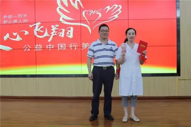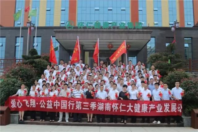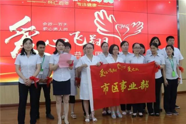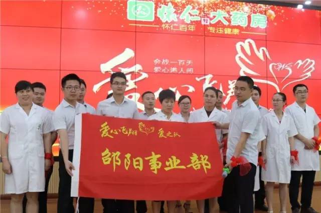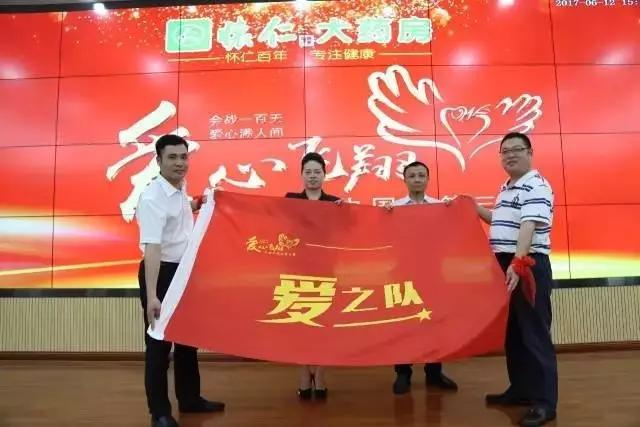 陈荣华、何家巨向陈毳萍及怀仁大药房总经理刘子杰授湖南省爱之队队旗,怀仁大药房正式开启“爱心飞翔”第三季。