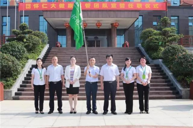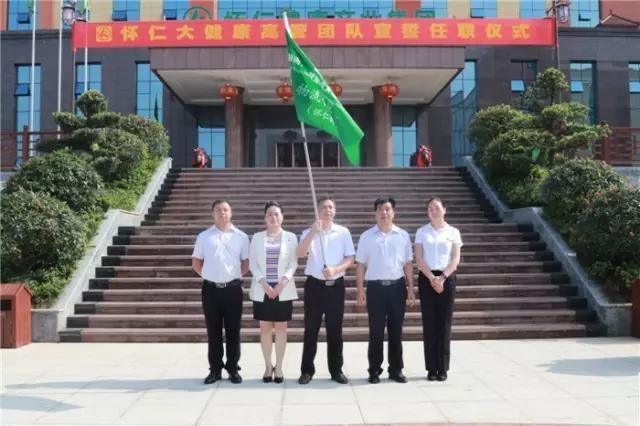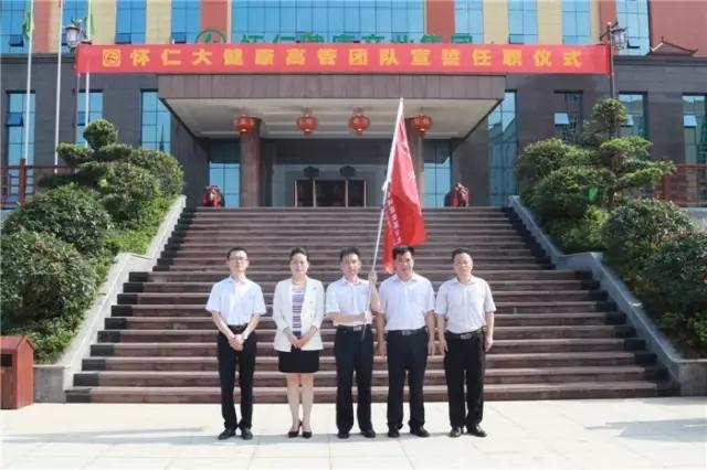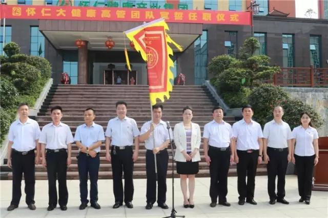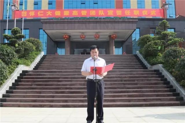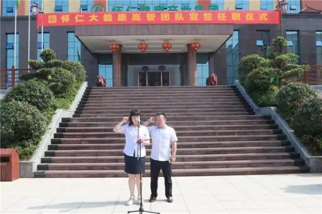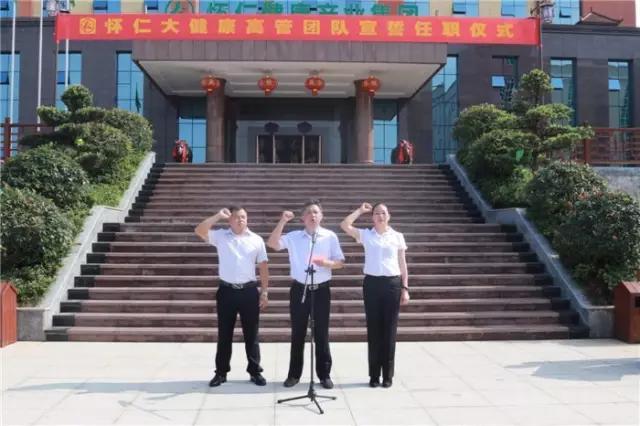 林承雄董事长、党总支书记陈毳萍先后宣读了组织机构设置及人员任职通知,怀仁大健康总裁室、各事业中心(分公司)总经理室成员先后上台宣誓、接受战旗。