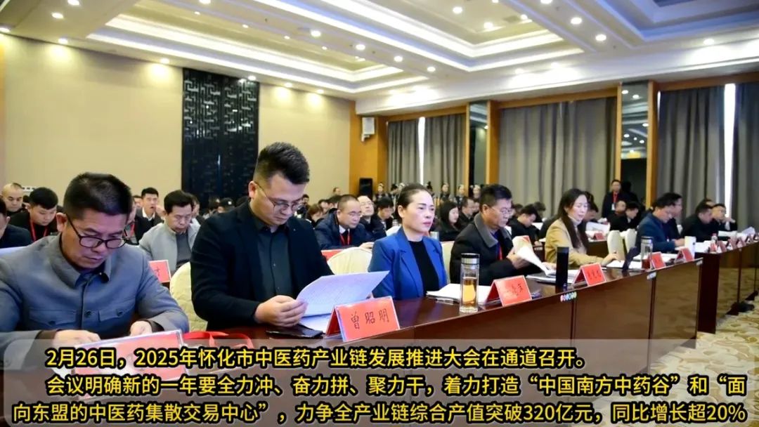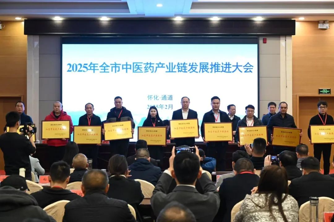 2月26日,2025年怀化市中医药产业链发展推进大会在通道侗族自治县召开。会议明确新的一年要全力冲、奋力拼、聚力干,着力打造“中国南方中药谷”和“面向东盟的中医药集散交易中心”,力争全产业链综合产值突破320亿元,同比增长超20%。怀化市委副书记、市委政法委书记、市中医药产业链链长贺遵庆出席并讲话,怀化市人大常委会副主任、市中医药产业链副链长黄雪鸿参加。湖南省博世康中医药有限公司作为全市龙头企业代表之一,怀仁集团党委书记陈毳萍受邀作主题发言。凭借在中医药领域的突出贡献和创新成果,博世康荣获“2024年度最具带动力中医药企业”和“2024年度知名中医药产品品牌”两项殊荣。