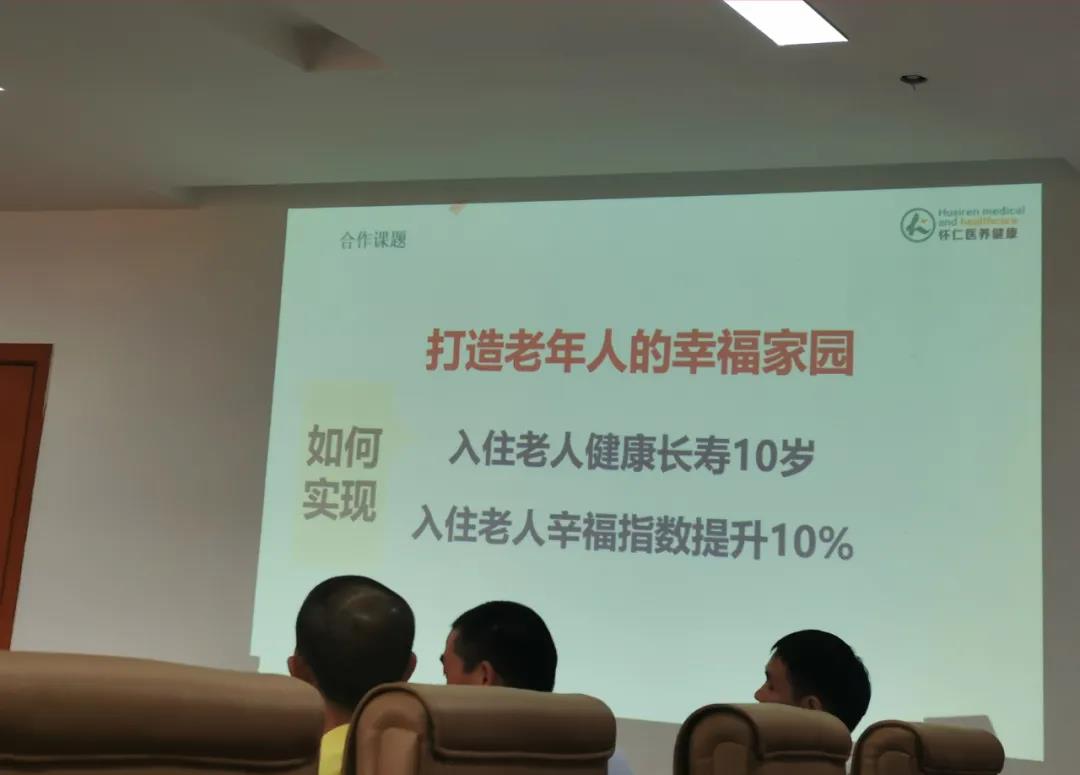 林承雄董事长对湖南医药学院领导的到来表示诚挚欢迎。他详细介绍怀仁康养产业园的建设进度、设计理念、功能定位,以及一个目标两个指标的康养理念。正在建设的怀仁生态康养产业园,总建筑面积16.4万平方米,明年建成投入使用,可以同时满足5000人的康养,新增1000个就业岗位。将打造成老年人健康养老幸福家园,实现两个指标:一是让园区康养老人健康增寿10年,第二就是幸福指数提高10%。