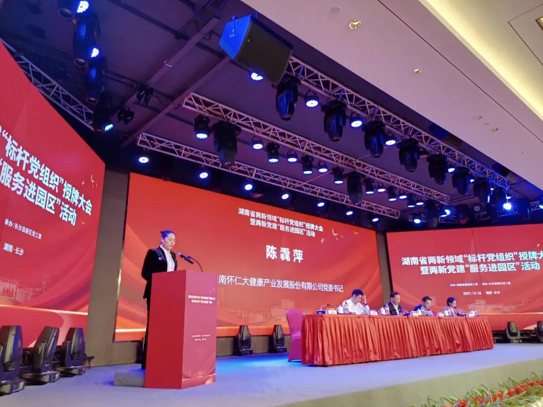 2021年12月16日,湖南省两新领域“标杆党组织”授牌大会暨两新党建“送服务进园区”活动在长沙高新区举行。省委组织部副部长、省委两新工委书记陈潇,省市场监管局党组书记、局长、省委两新工委副书记向曙光,省委统战部副部长、省委两新工委副书记、省工商联党组书记刘事青,长沙市委常委、市委组织部部长罗缵吉出席。怀仁大健康党委被授予湖南省两新领域“标杆党组织”荣誉称号。