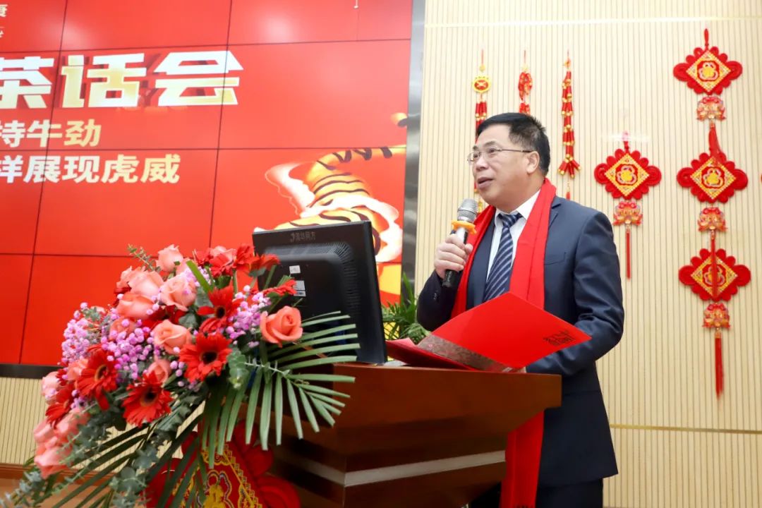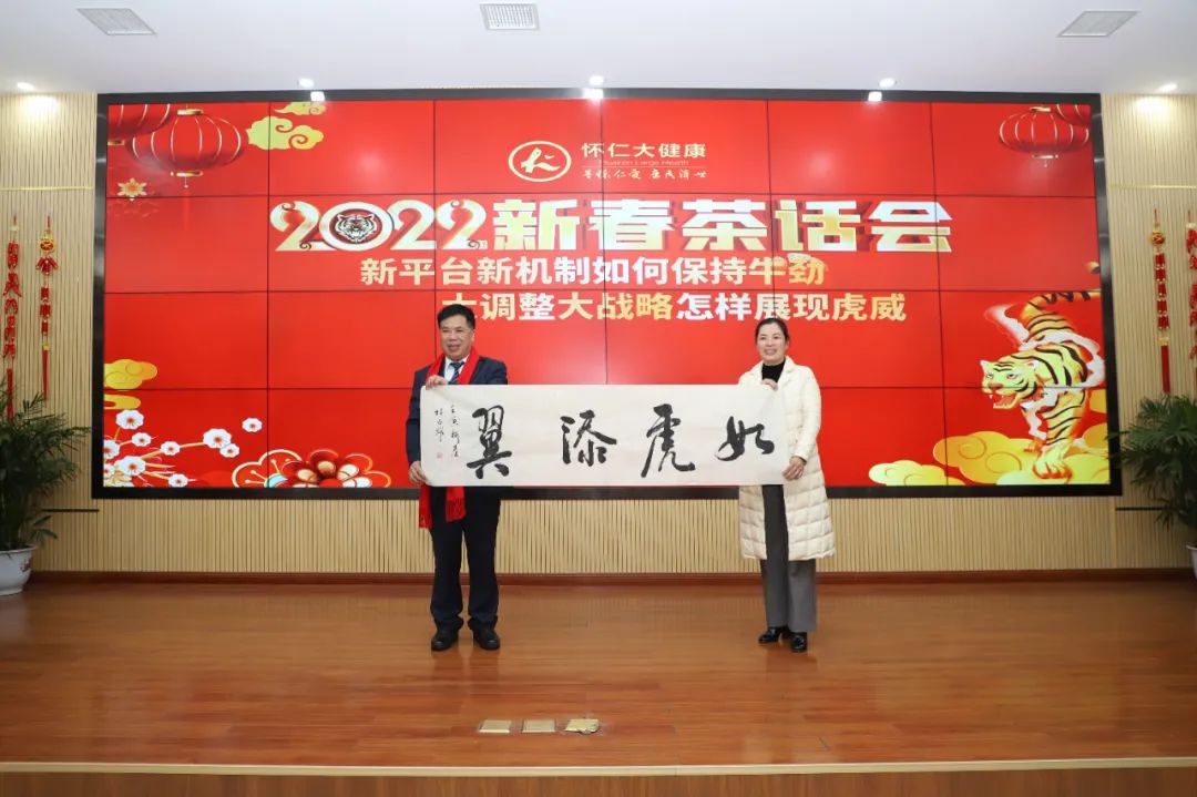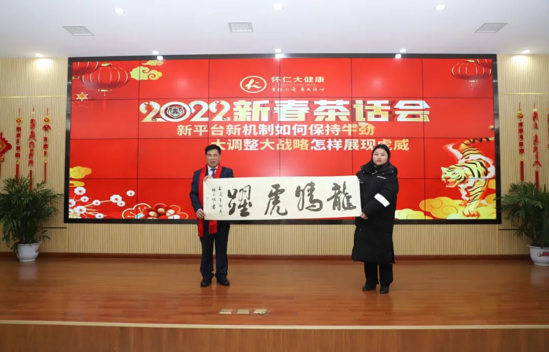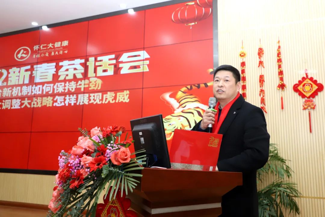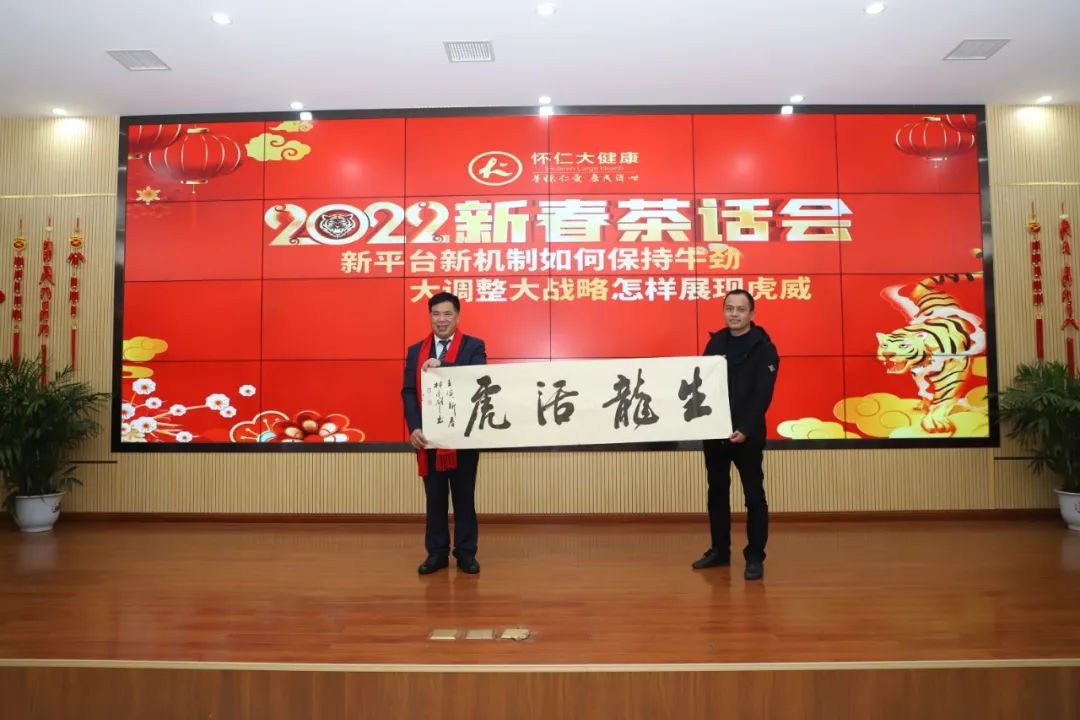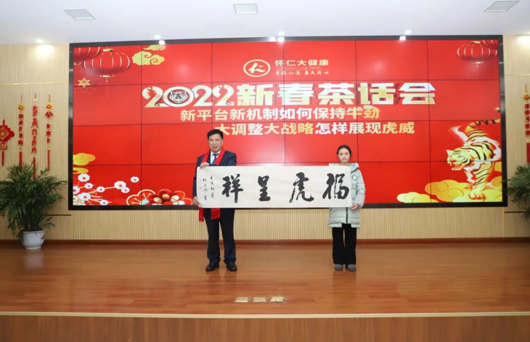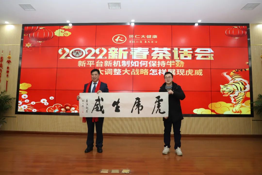 茶话会喜庆祥和、暖意融融。在观看振奋人心的2021年怀仁大事记视频后,林承雄董事长发表鼓舞人心的讲话。他说,“新平台新机制开辟大健康服务新局面仍需牛劲,大战略大调整成就中医药产业大梦想更要虎威!”这是今年春节我撰写的两幅对联,表达今年大健康服务要搭建新平台,建立新机制,开辟新局面,仍然要保持牛吃得苦、霸得蛮的干劲,艰苦奋斗、乐于奉献的精神。怀仁发展战略进行大调整,重点发展中医药和康养,突出中医药特色,发展中医药产业,成就中医药梦想,更加要有虎的力量、勇敢、无畏;以虎虎生威的雄风、生龙活虎的干劲、气吞万里如虎的精神,敢闯、敢拼,杀出一条血路,打造中国食药黄精第一品牌。林董事长希望大家在壬寅虎年,个个如猛虎下山,人人当虎将福将,为怀仁大健康事业建功立业,猛晋新功!