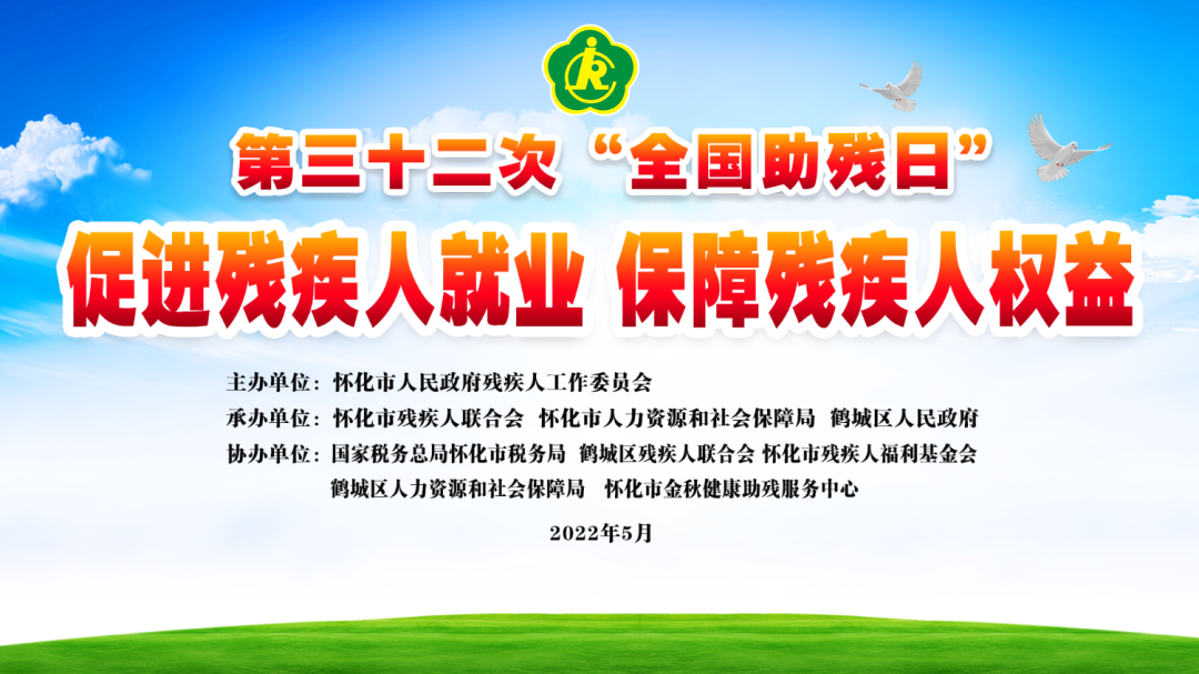 2022年5月15日,由怀化市人民政府残疾人工作委员会主办,怀化市残疾人联合会、怀化市人力资源和社会保障局、鹤城区人民政府承办,国家税务总局怀化市税务局、鹤城区残疾人联合会、怀化市残疾人福利基金会、鹤城区人力资源和社会保障局、怀化市金秋健康助残服务中心协办的第三十二次“全国助残日”暨怀化市残疾人就业(鹤城)专场招聘会活动在怀化市政广场隆重举行。此次活动主题是“促进残疾人就业,保障残疾人权益”。
