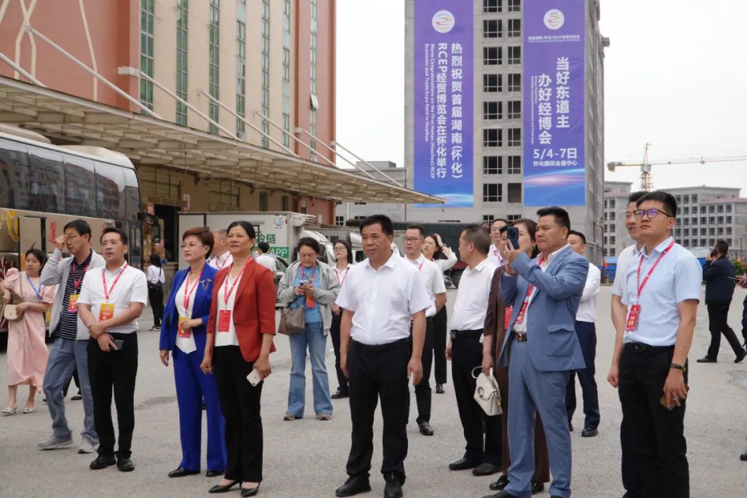 5月5日上午,首届湖南(怀化)RCEP经贸博览会开幕式暨西部陆海新通道助推RCEP经贸合作论坛在怀化举行。下午,在市委市政府的组织安排下,怀仁集团有幸作为怀化市知名企业,接受来自全国各地知名企业家的参观考察,怀化市政协副主席肖莉杏,市商务局党组成员、副局长王辉,市投资促进事务中心主任黄渊博陪同考察,怀仁集团董事长林承雄、副总裁舒敏作热情接待。