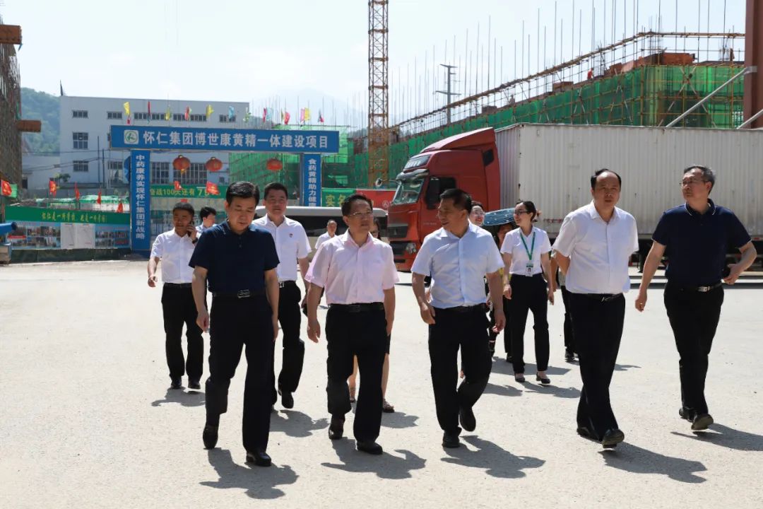 在“双轮驱动新发展格局”产业介绍展板前,李大剑委员一行听取了博世康黄精产业链“一体两翼三中心”建设进度与发展规划。“一体两翼三中心”即以怀化市主城区为主体,建设黄精精深加工和道地中药材冷链物流中心;以新晃黄精产地加工及交易商贸城、麻阳长寿谷为两翼;强力建设三个中心:博世康黄精文化博览文旅中心、黄精科技研发与质量检测中心、黄精种苗选育和科普教育中心。目前,14800平米的新晃黄精城产地加工项目已建成投产,57000平方米黄精深加工、科技研发、冷链物流大楼项目预计2023年年底投产。