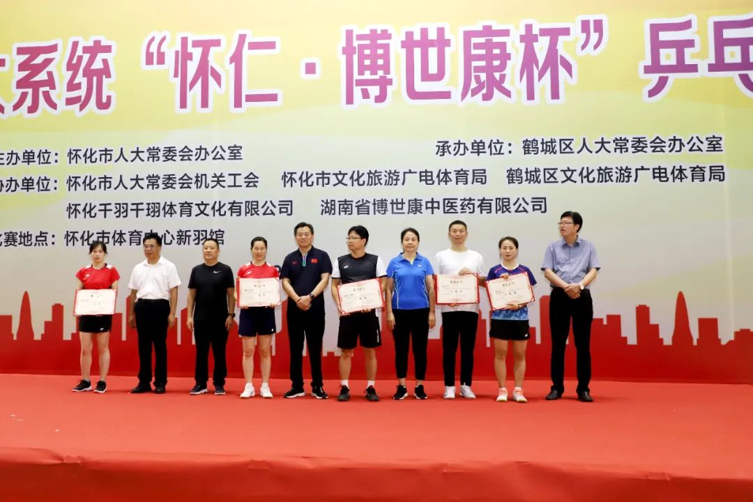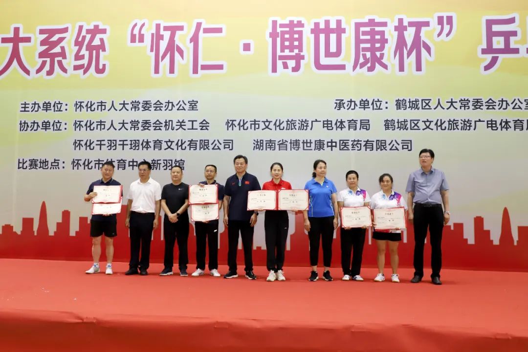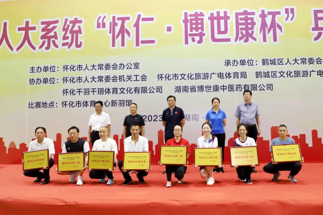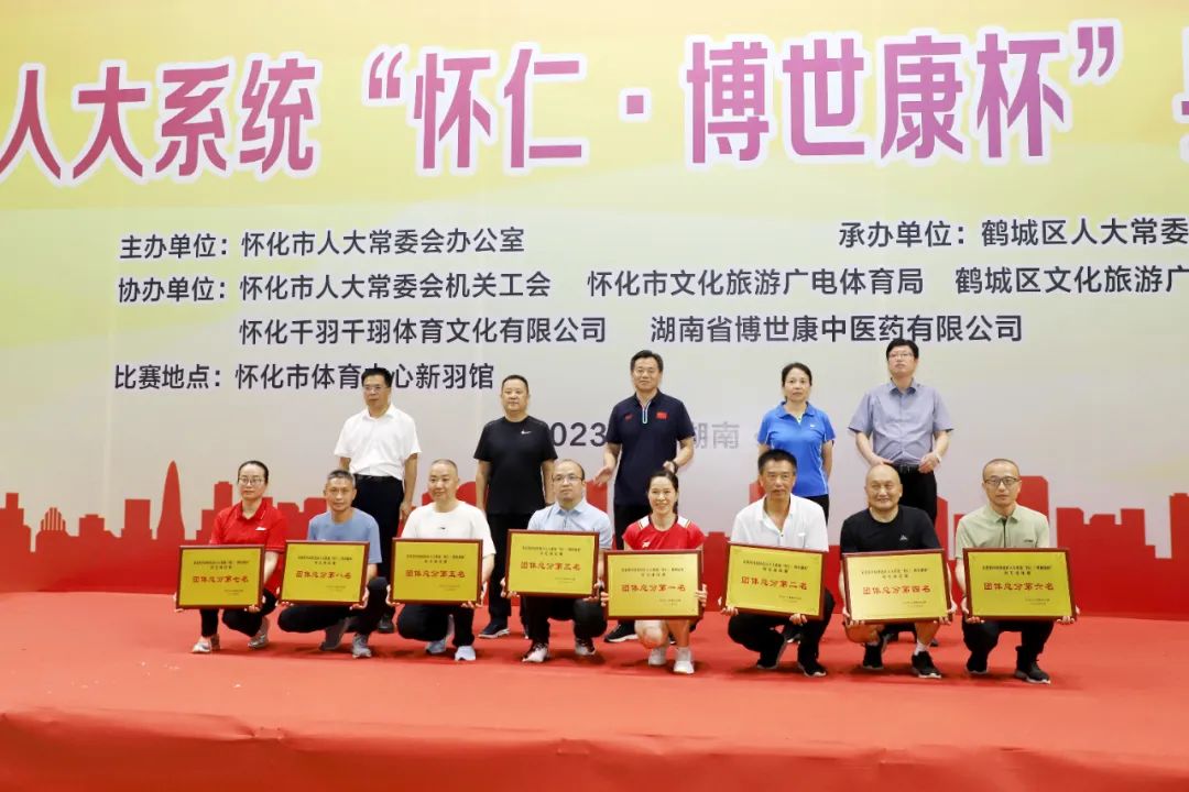 7月8日晚上9点,第四届怀化市人大系统“怀仁•博世康杯”乒乓球、羽毛球比赛在怀化体育中心圆满闭幕。怀化市人大常委会原党组书记、代理主任石希欣,市人大常委会副主任向建平,市人大常委会党组成员、秘书长李述文,怀仁大健康产业集团董事长林承雄出席活动并为获奖单位颁奖。